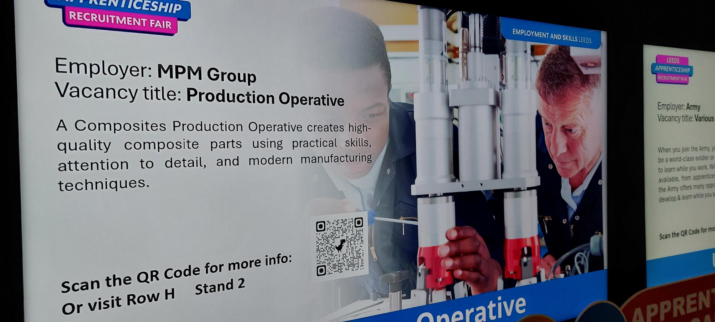 Live apprenticeship vacancies were advertised on digital display boards throughout the day, featuring roles such as production operatives, apprentice pipefitter / welders, apprentice automation engineers, quality inspector and quality engineers.